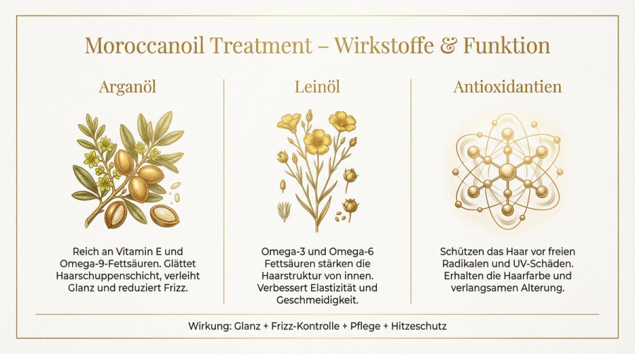 Das Moroccanoil Treatment Original basiert auf einer einzigartigen Kombination aus hochwertigem Arganöl, Leinöl und Antioxidantien. Das Arganöl aus Marokko ist reich an Vitamin E, Fettsäuren und Polyphenolen, die das Haar intensiv nähren und schützen. Das Leinöl ergänzt die Formel mit Omega-3-Fettsäuren, die die Haarstruktur stärken und Frizz reduzieren.