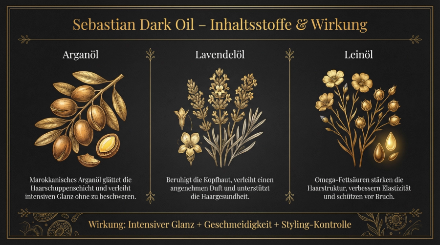Die drei Schlüsselöle haben unterschiedliche Wirkprofile: Arganöl (Argania Spinosa Kernel Oil) ist reich an Vitamin E und Fettsäuren und schützt vor oxidativen Schäden. Sandelholzöl (Fusanus Spicatus Wood Oil) hat intensive feuchtigkeitsspendende Eigenschaften und verleiht dem Produkt seinen charakteristischen Duft. Zedernöl (Juniperus Mexicana Oil) stärkt die Haarfaser und ergänzt den Duft mit einer holzigen Note. Wissenschaftliche Studien belegen, dass Arganöl die Haarfaser vor oxidativen Schäden schützt und die Kämmbarkeit signifikant verbessert.